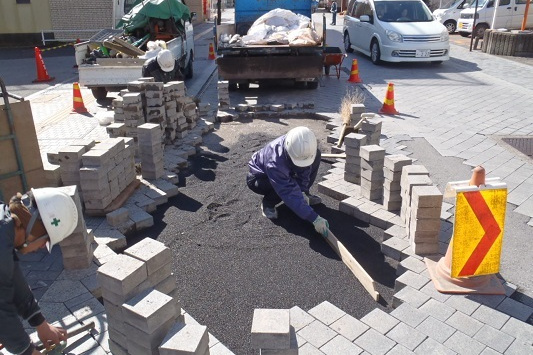 また、近年では目地・下地にセメント系やポリマー系の材料を用い施工基盤とブロックを強固に接着させ、重交通に対応する工法も開発されておりますが、施工費が高い、養生時間が必要で規制費用がかかる、修繕や解体が容易でない、ブロックが再利用できない等の問題点も指摘されております。